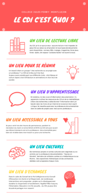 Le Centre de Documentation et d'Information est ouvert tous les jours sauf le mercredi. Mme Guyon, professeure documentaliste, accueille les élèves lors des permanence, des heures de cours dédiées ou des projets spécifiques et sur le temps du midi.